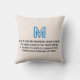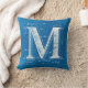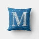 A detailed blueprint-style illustration of the letter M is presented against a vibrant blue background. The letter itself is rendered in white, with intricate details and precise measurements indicated by thin white lines. The back of the pillow includes a blue outline of the letter M set against a textured light beige background with a 4-line poem about the letter below.