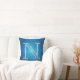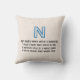 A detailed blueprint-style illustration of the letter N is presented against a vibrant blue background. The letter itself is rendered in white, with intricate details and precise measurements indicated by thin white lines. The back of the pillow includes a blue outline of the letter N set against a textured light beige background with a 4-line poem about the letter below.