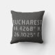 La almohada de lanzamiento muestra las coordenadas del mapa de latitud y longitud de Bucarest Rumanía en el moderno tipo de letra urbana sobre fondo gris oscuro