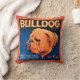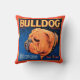 Impresión de una etiqueta vintage de la caja que ilustra un bulldog con un fondo con estampado azul y un borde naranja. Elija esta impresión de arte en su producto Zazzle hoy.