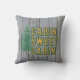 Una almohada de tiro para los amantes de las cabinas de sus secuoyas. Texto "Cabina dulce" sobre fondo de madera gris templada