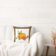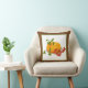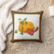 Calabaza bayas, hojas caen colores Día de Acción de Gracias cojín. Cuenta con una calabaza amarilla y naranja con hojas y bayas rojas. Hay un borde marrón alrededor de ella.