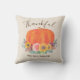 Esta almohada rústica de caída arroja está decorada con una acuarela de diseño de calabaza, girasoles, eucalipto y vegetación. Personalizable fácilmente con tu nombre. Dice "Agradecido" en tipografía de escritura elegante. Acuarela original © Michele Davies.
