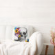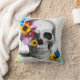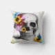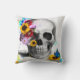 Pintura digital original. Calavera humana realista en escala gris, flores silvestres coloridas y mariposas que crecen desde el portalámparas. Placa de pintura acuarela. girasoles amarillos, margaritas rosas y violetas y amapolas rojas. Diseño moderno del cráneo de azúcar.
