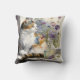 Una almohada decorativa con un bonito cuadro de un gato calico sentado junto a un jarrón de flores violetas y una ventana en la que entra la luz del sol.