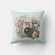 A pillow with a vintage styled camera decorated with flowers. Pastel colors of pink, cream and green.