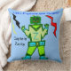 Chico alienígena verde de Guay Capitán Zacky personaje de caricatura frente a la almohada con fondo azul claro. BACK de almohada PERSONALIZAR cuadro de texto para insertar el nombre del niño. El Capitán Robot Verde Z, lindo y sonriente, ha venido a decir Hola, con traje amarillo y verde, botas de espacio azul claro y el aspecto de luces 3D coloridas como accesorios, y tornillos de luz amarillos, negros y rojos. Obra de arte original © 2014 TamiraZDesigns. Todos Los Derechos Reservados.