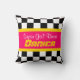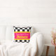La almohada original del dormitorio para los chicas. Perfecto para una habitación de chicas con estilo de carreras. Presenta un texto gráfico rosa y amarillo brillante y rayas de bandera a cuadros y una bandera de cuadros al revés. Personalizar con las palabras y el nombre de su elección. Actualmente se lee Super Chica Racer Danica. Gráfico diseñado de forma única por Sarah Trett.