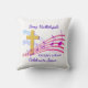 Modern SING HALLELUJAH CHRIST IS RISEN Christian Easter Throw Pillow, showing a gold colored empty cross in amongst colorful music staves. The Easter text appears in a mauve color. These words will be sung by Christians the world over to celebrate the resurrection of our Lord Jesus Christ at Calvary. This modern Christian Easter pillow would make a great gift for birthdays, at Christmas, throughout the year, but particularly for Easter. Choose from a wide selection of Christian Easter designs on cards, invitations, home decor, clothing and gifts, designed by Berean Designs. Matching Christian gifts available.