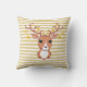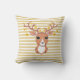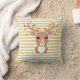 Hermoso ciervo de Navidad decorado con bolas doradas sobre cojín de funda con fondo a rayas.