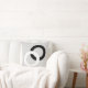 Elegante círculos interconectados en blanco y negro sobre almohada gris claro.