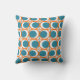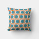 Esta almohada de tiro tiene un diseño moderno de mediados de siglo de círculos naranjas abiertos con círculos verde azulados sólidos que atraviesan el patrón con líneas verticales verde azuladas y líneas horizontales naranjas.