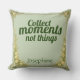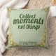 Inspire mindful living with this sage green throw pillow featuring "Collect moments not things" in forest green. Beautiful nature-inspired home decor for bedrooms, reading nooks, or living rooms. Perfect gift for travelers, minimalists, and nature lovers who value experiences over possessions. Earthy color palette complements boho, farmhouse, and natural interior styles.