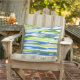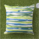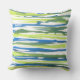 Almohada impresa con un diseño abstracto a rayas en azul, verde y blanco, a partir de la pintura acuarela original.