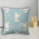 Un adorable conejo blanco sostiene una flor rosa en el patrón de esta almohada para la guardería del bebé. Cerca de la parte inferior hay un óvalo con el nombre del bebé y la fecha de nacimiento. Todo está colocado sobre un fondo azul mediano. La parte posterior de la almohada tiene el mismo patrón sin el óvalo ni el texto. ¡Un regalo adorable para el baby shower!