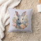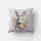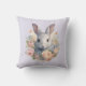 Una almohada con una imagen dulce y adorable de acuarela. Un conejo con pelaje blanco y gris. Una guirnalda de flores de clavel en colores pastel rosa y melocotón. Una imagen linda para Pascua, cumpleaños o baby shower para amantes de los conejos.