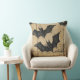 Los retoños de Halloween con denim blanquecino arrojan almohada con murciélagos cocidos en vuelo. La textura estridente y estridente con puntos fuertes crea una estética gótica rústica. Ideal para los amantes de los murciélagos, decoración gótica o regalos únicos de Halloween.