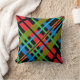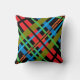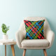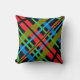 Esta alegre almohada de lanzamiento muestra un colorido patrón abstracto de líneas cruzadas en rojo, naranja, verde, amarillo, azul y negro sobre un fondo negro. La imagen se repite en la parte posterior.