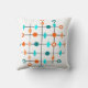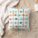 Esta almohada de tiro tiene un diseño moderno de mediados de siglo de una cuadrícula en líneas negras con círculos y diamantes naranjas y verde azulados.