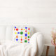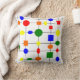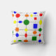Esta almohada de tiro tiene un diseño Bauhaus de una rejilla con formas en rojo, amarillo, naranja, verde y azul trazados sobre ella.
