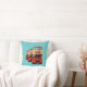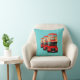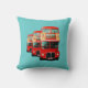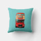 Cushion (almohada de tiro) en un color jade ilustrado con un montaje de tres buses londinenses. Al revés hay una sola imagen del bus de Londres de tiempos pasados.