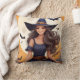 Tira la almohada con una alegre bruja joven de pelo largo conduciendo un palo de escoba frente a una luna grande y brillante llena. Los murciélagos vuelan a su alrededor, sumando a la encantadora escena nocturna.