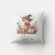 Una vaca de las tierras altas está usando un gorra de bruja con flores rosas y una calabaza. Cojín decorativo de Halloween. Haga especial este día y celebre con su familia y les deseo una feliz Halloween.