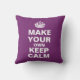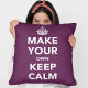 Una plantilla de almohada de lanzamiento en el estilo Mantener la calma y continuar. El texto del marcador de posición indica Hacer su propia calma. Simplemente edite el texto en los cuadros de la derecha de la imagen y puede cambiar el mensaje para decir lo que desee. Ya no estás limitado a lo que puedes encontrar en el mercado - ¡tu imaginación es el único límite! Mostrado en color púrpura, el color se puede personalizar pulsando 'Personalizar más adelante' > Editar > Fondo.