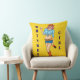 Tirar la almohada con un dibujo pop en el ilustracion de un chica de rodeo en un gorra de vaquero y un vaso de whisky en la mano contra un fondo amarillo con puntos blancos.