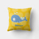 Ballena azul estilizada de dibujos animados lindos sobre un fondo amarillo brillante con lunares grandes y gordos, decoración de guardería, cojín personalizado con el nombre del niño.