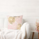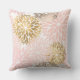 Esta atractiva almohada presenta un modelo de dalia abstracta de gran tamaño, hecho en bronce y oro rosa suave y brillante. El patrón se coloca sobre un fondo blanco. Ambos lados de la almohada tienen el mismo diseño.