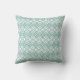 Esta almohada de tiro tiene un diseño art deco de diamantes superpuestos en verdidor (verde) y azul sobre un campo de blanco.