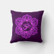 Un símbolo violeta brillante de Aum se sienta dentro de una flor de loto estilizada. El modelo circular se destaca para crear un brillo ligero en la superficie que se sienta en un fondo de color morado oscuro. Seis hojas elegantes alcanzan hacia fuera del centro del diseño para crear un modelo simétrico hermoso. Este diseño elegante de la almohada es una representación llamativa de este símbolo espiritual.