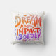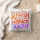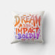 The pillow design features the inspirational phrase "Dream Big Impact Boldly" in vibrant, multicolored lettering. The colors are arranged in a dynamic, eye-catching pattern that conveys a sense of energy and enthusiasm. The design is bold and impactful, perfect for adding a touch of inspiration to your bedroom or living space.
