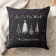 Elegant Modern Christmas Stars Pillow with Family Name designed with white Christmas trees with gold colored stars on a black background and white stars covering the pillow. The front text reads: Joy To The World, along with your Family Name. The reverse text reads: Merry & Bright with your Family Name. To personalize simply insert your name into our easy template, replacing the sample. Makes a great Christmas gift for someone special, or to decorate your home for the holidays. Note: Inserting your Family Name into the template with automatically repeat on the reverse.