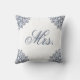 Esta elegante almohada blanca y azul con la palabra manuscrita Sra. es un producto coincidente para hacer un conjunto de dos almohadas para los recién casados. Es una hermosa decoración para el hogar que presenta florituras de mandalas en las esquinas. Decora el dormitorio, la sala de estar u otros espacios de manera elegante. Este diseño es una buena idea para una decoración moderna de granja o como parte de un estilo boho chic.