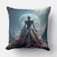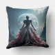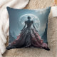 Una figura misteriosa en un vestido elaborado se alza ante una luna llena de brillo, frente a un paisaje rocoso dramático. La escena se ve realzada por el contraste entre los detalles intrincados del vestido y el terreno escarpado.
