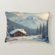Escena de invierno de inspiración alpina con un acogedor chalé rodeado de árboles cubiertos de nieve y majestuosas montañas. Perfecto para la decoración rústica, el arte de temporada y la inspiración de las vacaciones.