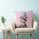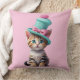 Un gatito lindo con ojos azules brillantes lleva puesto un gorra colorido y caprichoso coronado con un gran pom-pom. Su piel combina naranja, blanco y tonos pastel, lo que le confiere un aspecto alegre y encantador. Fondo rosa