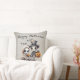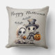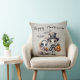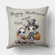 Esta almohada de tiro con temática de Halloween presenta un ilustracion de estilo personalizado gótico y espeluznante. Una imagen de un esqueleto de niño con un sombrero de punta y una chaqueta de traje, y una pequeña muñeca fantasma de porcelana chica son retratadas en la parte inferior. Dos lindos murciélagos vuelan sobre sus cabezas mientras llevan sus lámparas de gato por la noche. Un saludo de "Happy Halloween" se imprime en la parte superior de la almohada con un elegante guión. El fondo presenta un patrón de sombra.