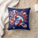 Esta divertida almohada de tiro de voleibol chica presenta una "explosión" de formas variadas de estrella rojas, azules y blancas en un fondo azul personalizable más oscuro - los paneles rojos y azules de las bolas de voleibol se mezclan con un patrón kaleidoscópico giratorio y floral - personalizado con el nombre del atleta y el número de camiseta en la parte delantera y trasera - katz_d_zynes