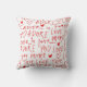 Esta almohada contiene un patrón lúdico de palabras manuscritas como "AMOR", "ADORE" y "PARA SIEMPRE", mezcladas con formas cardíacas, todas con tinta roja sobre un fondo blanco. La disposición aleatoria y superpuesta de estos elementos crea un diseño denso y visualmente atractivo. Este patrón es perfecto para transmitir temas de amor y afecto