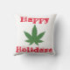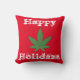 Felices almohadas de lanzamiento de Holiday. Personalizable y reversible. Gran hoja de hierba verde con fondo rojo y texto blanco que proclama "Felices vacaciones" en un lado y fondo blanco y texto rojo en el otro. Puede personalizar a su gusto cambiando el color de fondo, el tipo de almohada, el texto o la imagen.