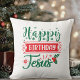 Feliz Cumpleaños Jesús lanzó almohada con colores festivos rojos y verdes con un brote de acentos holly y copos de nieve.