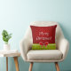 almohada festiva para navidades con rayas rojas y verdes y tipografía de "¡Feliz Navidad!" en el medio.
