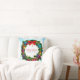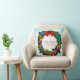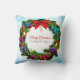 Una almohada divertida de vacaciones con un Navidad estaba decorada con ornamentos, campanas y dulces y "Feliz Navidad y Feliz Año Nuevo".