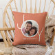 Este elegante Navidad Holiday Photo Pillow está decorado con la palabra JOY en una simple tipografía blanca sobre un fondo de terracota. Personalizable fácil con tu foto y nombre.