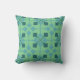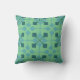Esta almohada de tiro tiene un diseño moderno de mediados de siglo de flechas en dos tonos azules sobre un campo de verde marino.