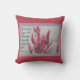 La almohada floral tira en tonos rojos y grises, con verso de Salmo 31:24 "Sé fuerte, y toma valor tu corazón, ¡todos los que esperas al Señor!"