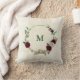 Hermosa almohada decorativa romántica con flores de champán y borgoña y algunas hojas verdes .
